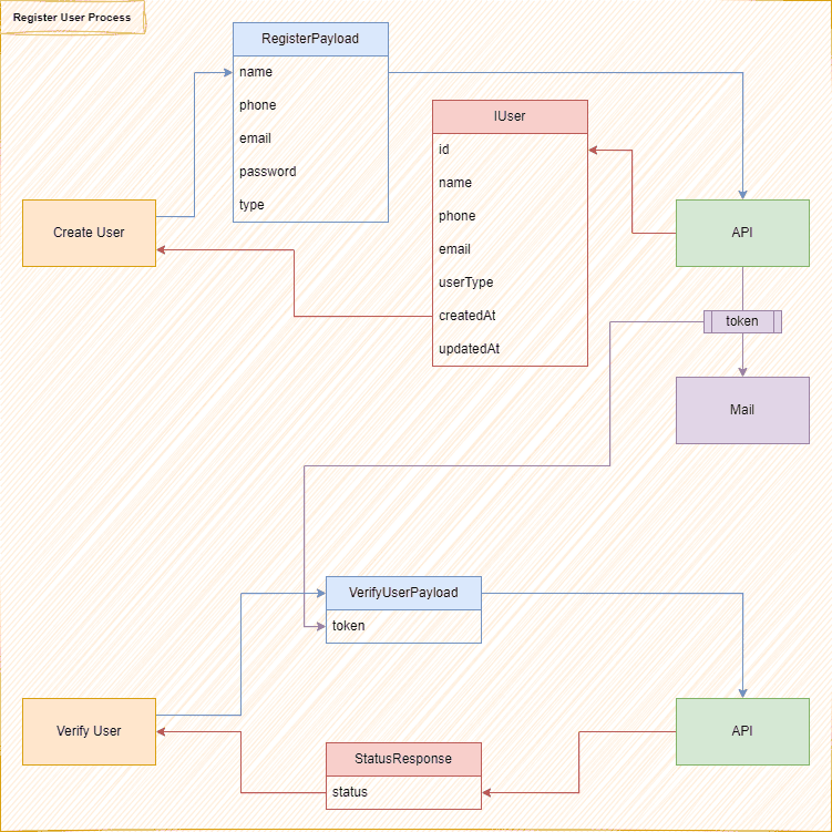 Register Process: This process have configured process, we have the process of requiring Email Verification, and without. In the API we will be building, I added this configuration to a config file. This process is quite simple too. We send the new users payload from client, The API checks the request body schema with