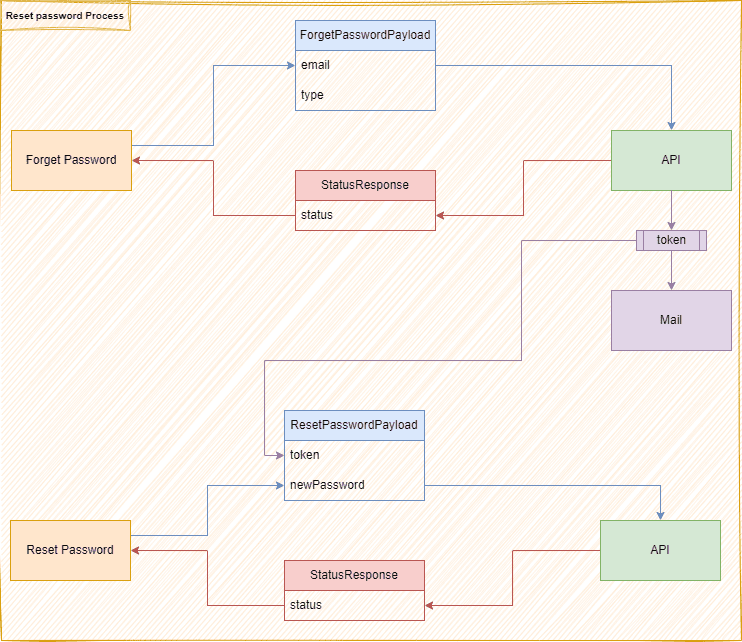 Reset Password Process: This process has two steps; The Forget Password triggering and the verification of Email, Then the reset password process. In the Forget Password step, The API receives the Email and Type (This type is business related property, For example we have many types of Users (ADMIN, User, Client...)). In this step, we only send the token in Email. This token is generated locally and stored in DB to validate it later. The Reset Process is triggered when the user clicks the link, goes to client side page and fill the Resetting password form. The new password is attached with the token and sent to API. After receiving the payload, we validate the token, update the password and finally delete the token from DB.