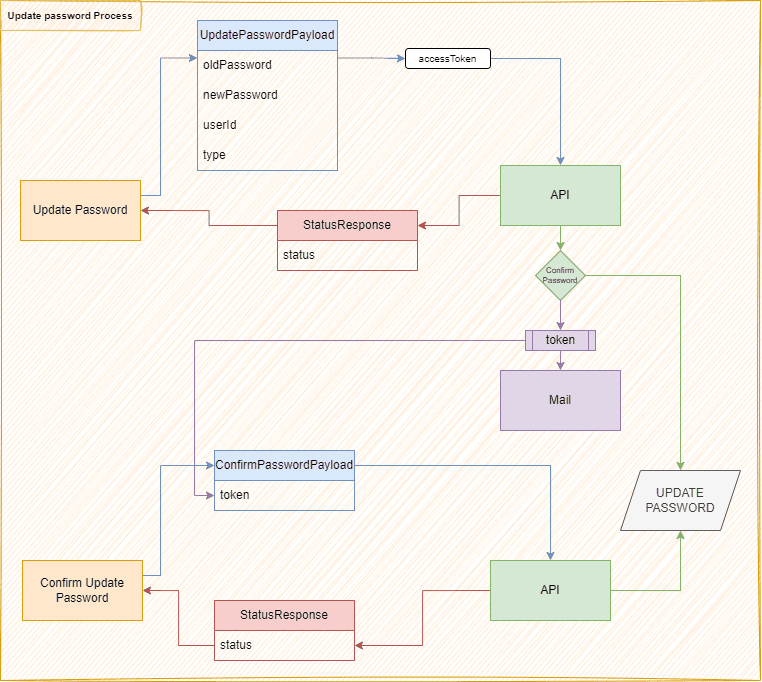 Update Password Process: This process is the only one in Auth System that requires the JWT Access Token provided in Login. We have two ways to update password (Configurable in the API as well). We have the simple one, Where we update directly the password, and the guarded one, where we only update after the user confirms the action through mail token. The simple way is simple as its name indicates. We just update the password, the access token is a way to confirm the user's identity (But not enough). Guarded way has another step for security check. Where we store the new password (Hashed of course), and add a token to that table. We send the token through email. After getting the token, The client sends it through