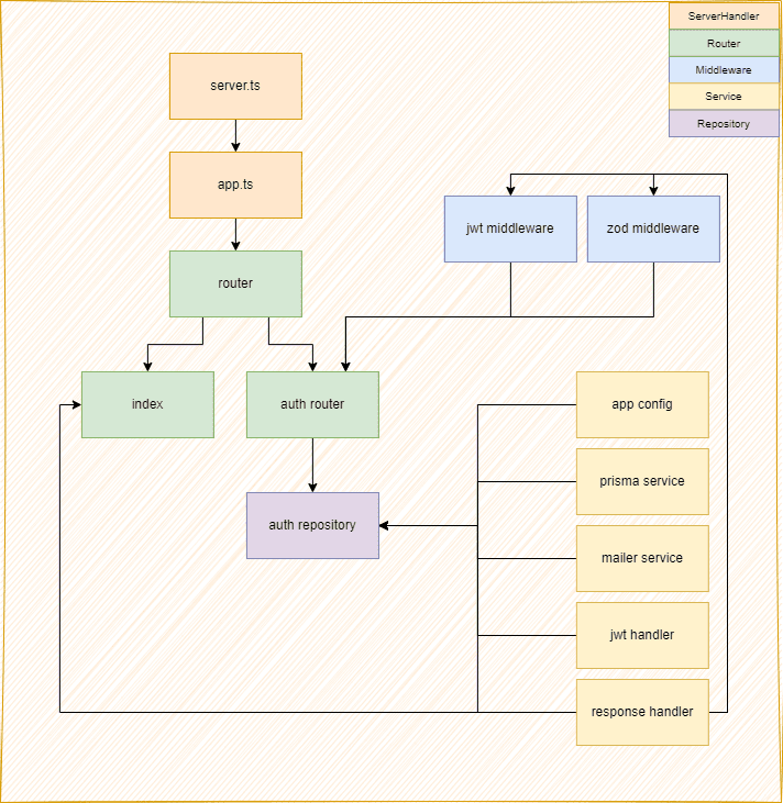 The app will roughly follow this approach. We separate the code by domain; Router handlers, Server Handlers, Repository Handlers and Services Dependencies.